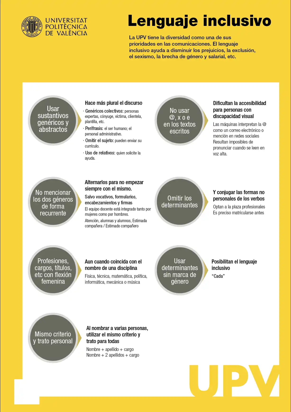 Ten siempre presente el uso del lenguaje inclusivo en cuanto al género. La UPV debe tener la diversidad como una de sus prioridades en las comunicaciones. Sobre todo porque el lenguaje inclusivo ayuda a disminuir los prejuicios, la exclusión, el sexismo, la brecha de género y salarial, etc.